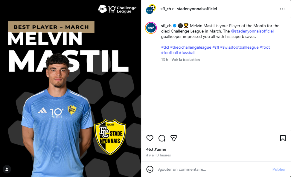توج ماستيل حارس مرمى نادي ستاد نيون، بجائزة أفضل لاعب في شهر مارس ضمن دوري التحدي (Dieci Challenge League)، بعد الأداء المميز الذي قدمه طوال الشهر.