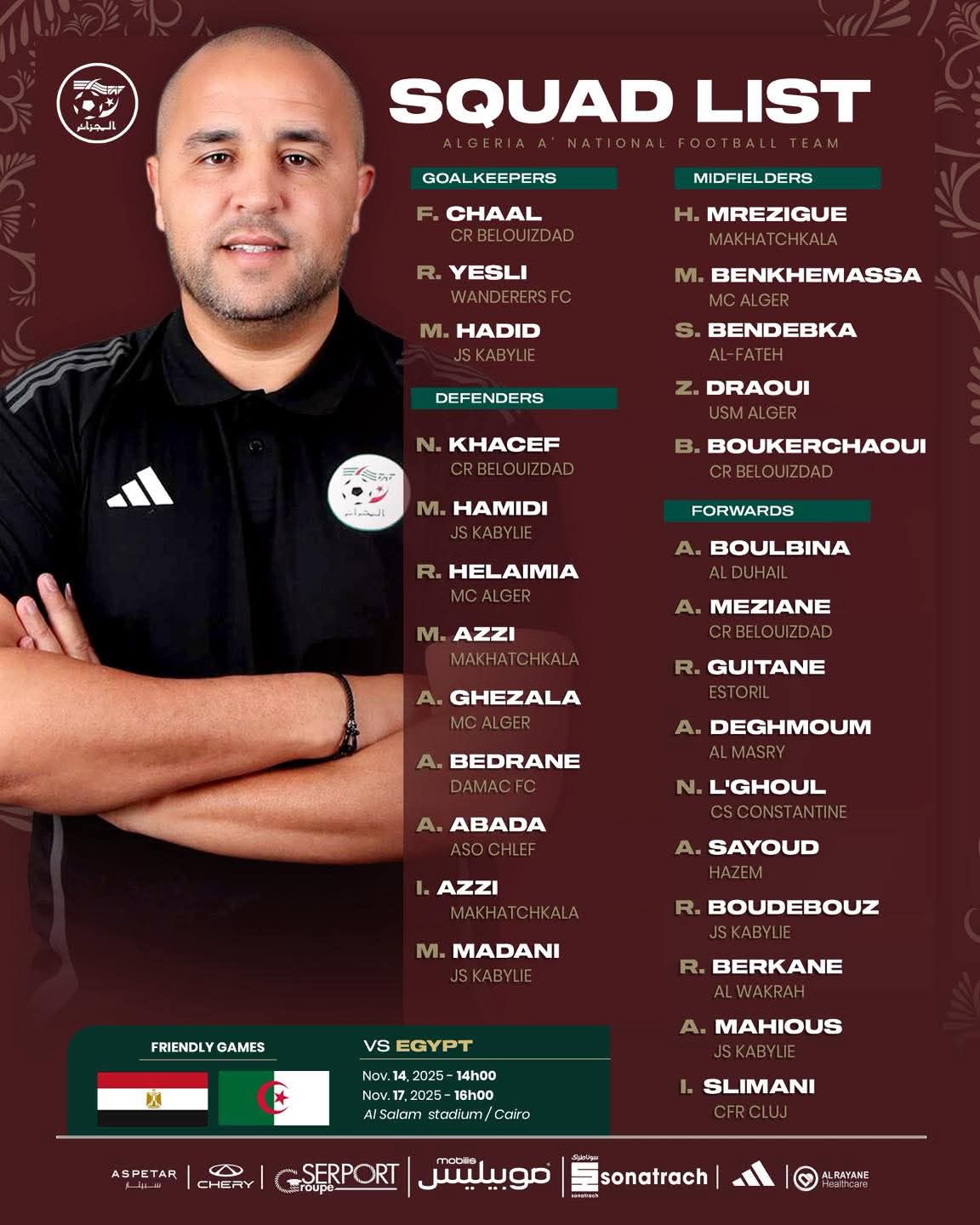 وستكون هاته القائمة معنية بتربص شهر نوفمبر والذي ستتخلله مواجهتان وديتان أمام منتخب مصر المحلي إستعدادا لبطولة كأس العرب بقطر.