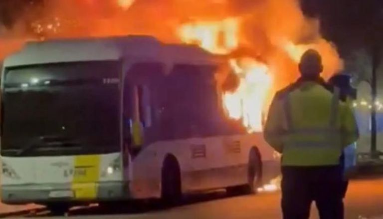 ورصدت عدسات المصورين اشتعال النار في إحدى الحافلات التي كانت تقل جماهير برشلونة إلى بلجيكا لحضور المواجهة.
