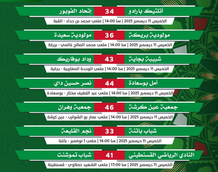 وبين طموح التألق ورغبة التأكيد، تبقى مباريات الخميس مفتوحة على كل الاحتمالات، في انتظار من سيتمكن من فرض نفسه ومن سيكتب اسمه ضمن مفاجآت هذا الدور من أغلى المسابقات الجزائرية.